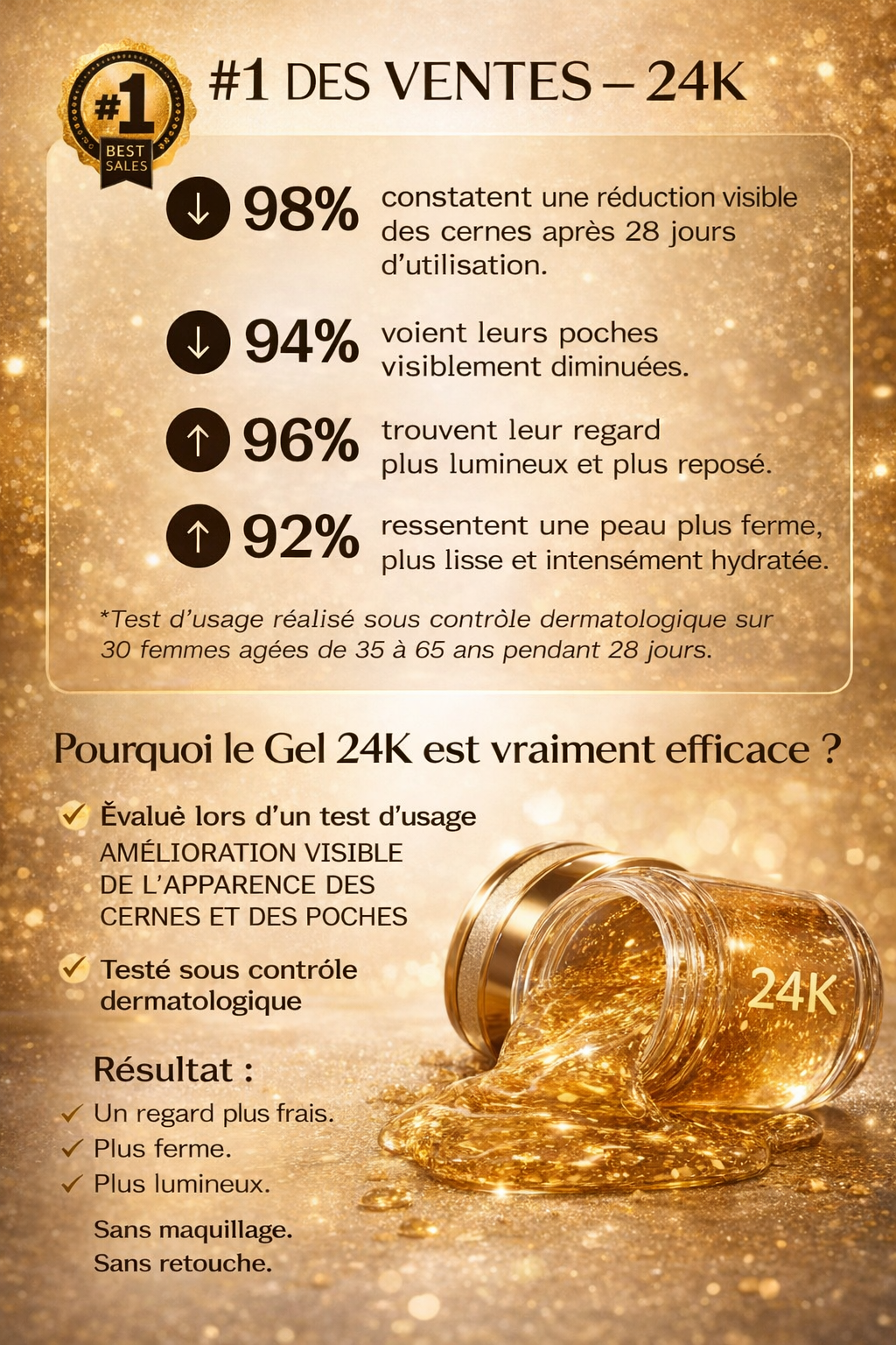 Grâce à sa formule enrichie en acide hyaluronique et particules d’or 24 carats, 24K aide à améliorer visiblement l’apparence du contour des yeux :